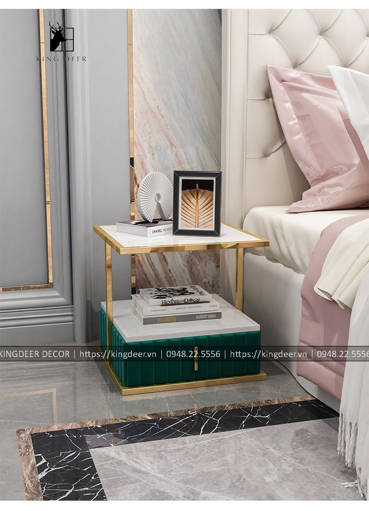 Phong cách hiện đại theo xu hướng Bắc Âu, bàn góc sofa Helen cuốn hút ngay từ cái nhìn đầu tiên. Hoàn thiện bằng inox 304 mạ titan vàng bóng cho vẻ đẹp sang trọng. Hộp ngăn kéo được bọc nỉ cẩn thận, vừa tạo không gian lưu trữ, vừa cho ta cảm giác ấm cúng. Mặt bàn bằng đá marble trắng vân mây có thể để trang trí các đồ decor, khung ảnh, tạp chí..