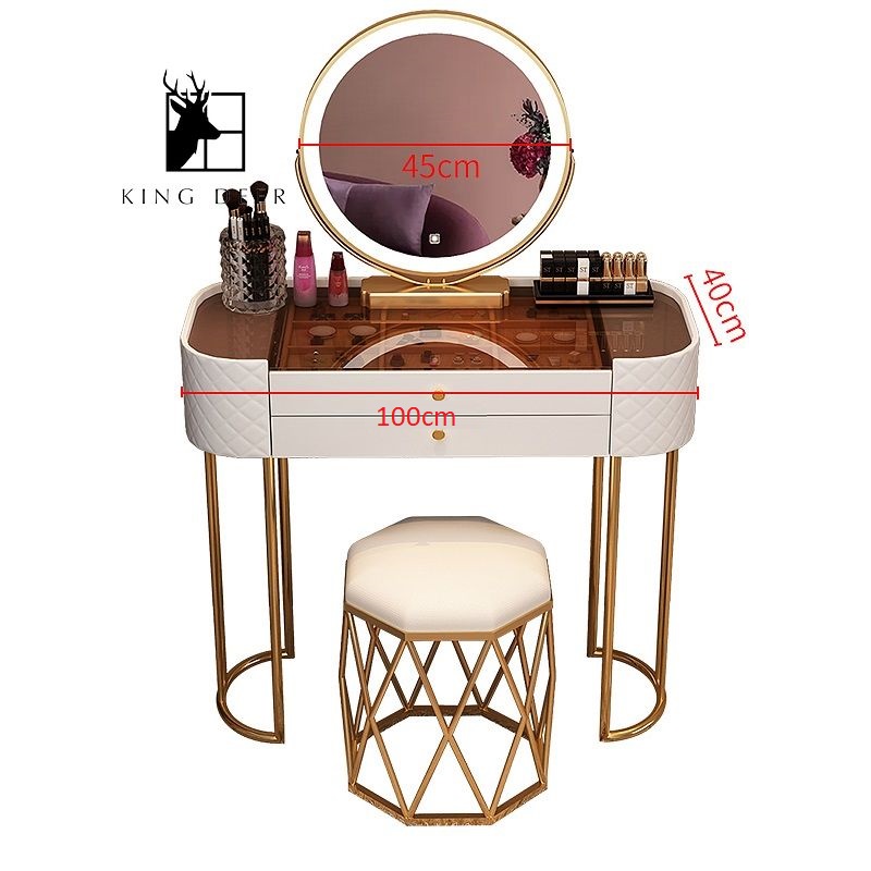 Vẻ đẹp đầy mê hoặc và thiết kế thời trang với bàn trang điểm Amabel tuyệt đẹp nhưng thiết thực này. Bàn trang điểm này có thể phù hợp với mọi loại phong cách nội thất. Mặt trên bằng đá trắng vân mây hoặc kính tạo một ấn tượng mượt mà. Khung sắt sơn tĩnh điện màu vàng hoàn hảo. Thiết kế ngăn kéo sang trọng với tay cầm tinh tế, hoàn hảo để lưu trữ tất cả đồ trang sức, mỹ phẩm và đồ làm đẹp của bạn. Tự hào với thiết kế có thể thu vào và mở rộng, nó có thể điều chỉnh để phù hợp với căn phòng của bạn. Nó có một tủ phụ để giúp bạn cất giữ những đồ đạc khác của mình. Được chế tác từ đá tráng vân mây hoặc kính, ván MDF và khung sắt sơn tĩnh điện, thiết kế cao cấp này đặt chiếc bàn trang điểm này vượt trội so với những chiếc bàn trang điểm khác.