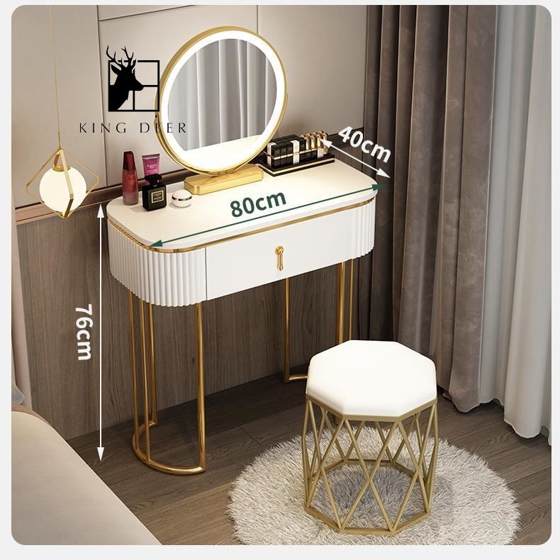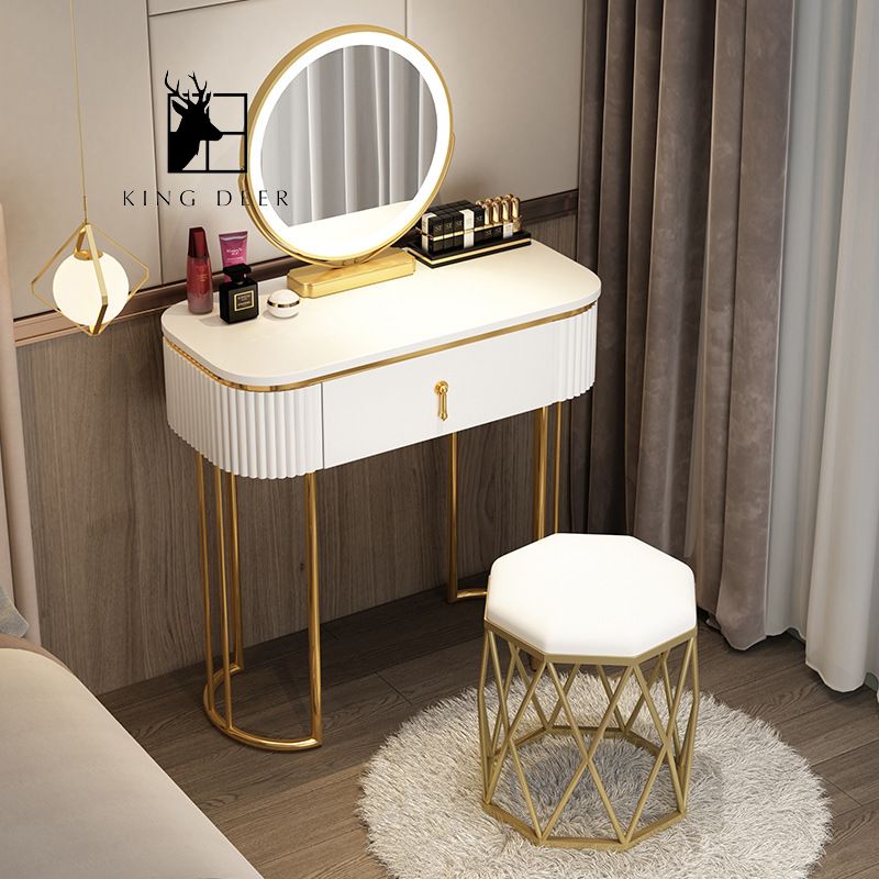 Bàn trang điểm Sharmaine hình bầu dục màu trắng lấy cảm hứng từ phong cách Bắc Âu và chân cong bằng sắt sơn tĩnh điện màu vàng, bộ bàn trang điểm trang điểm kiểu dáng đẹp này mang lại nét tinh tế tối giản, kết hợp hài hòa với bất kỳ kiểu trang trí hiện đại nào. Mặt bàn rộng và ngăn kéo cung cấp cho bạn khả năng lưu trữ phong phú cho mỹ phẩm, đồ trang sức và các vật dụng sử dụng hàng ngày. Bộ sản phẩm này bao gồm bàn trang điểm, gương và ghế đẩu hình tổ chim rỗng, chắc chắn sẽ mang đến cho bạn trải nghiệm trang điểm thú vị. Được làm từ ván MDF và sắt sơn tĩnh điện, nó đảm bảo vẻ đẹp lâu dài và sự hỗ trợ chắc chắn. Phòng ngủ của bạn cần có chiếc bàn trang điểm này.
