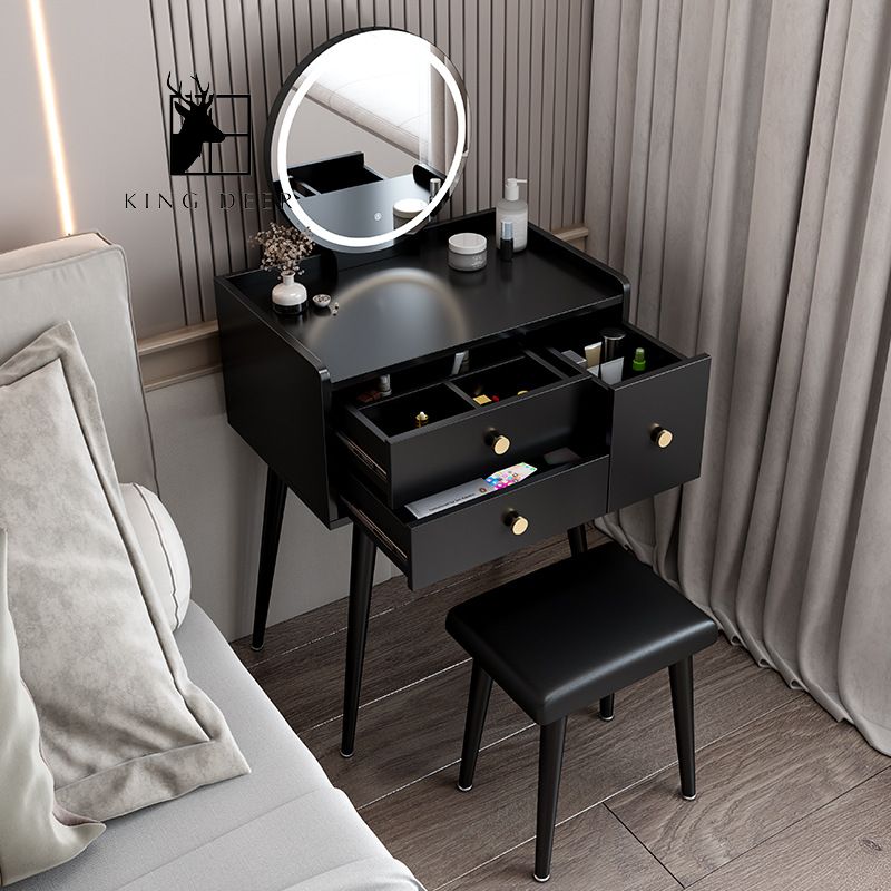 Với những chức năng thiết thực cũng như vẻ ngoài xinh xắn, chiếc bàn trang điểm Eira này kết hợp thời trang và sang trọng để phù hợp với mọi phong cách của bất kỳ căn phòng nào, hoàn hảo cho phòng ngủ của bạn. Được làm bằng gỗ MDF có độ bền cao khi sử dụng. Ba ngăn kéo trượt lớn cung cấp không gian rộng rãi cho đồ trang điểm và đồ trang sức của bạn. Với một chiếc ghế đẩu ghép đôi được bọc cùng màu, bàn trang điểm tạo ra một cái nhìn phối hợp. Khi không sử dụng, chiếc ghế đẩu có thể được lồng vào gầm bàn trang điểm.