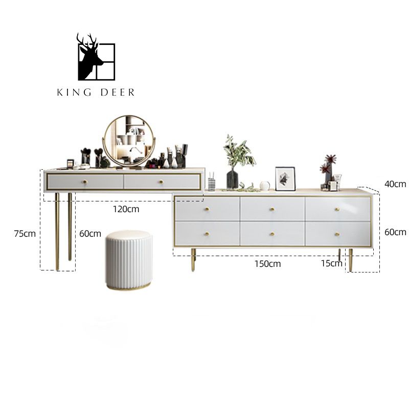 Bàn trang điểm Keisha với sự kết hợp đa năng giữa bàn trang điểm và tủ này tạo ra một nơi thư giãn và thoải mái để trang điểm, đồng thời gợi cảm giác thanh lịch và sang trọng. Bàn trang điểm có thể đặt 90 độ so với tủ để kê góc theo ý muốn của bạn hoặc thu lại vào đúng vị trí phù hợp với diện tích căn phòng của bạn. Hai ngăn kéo lớn và hai tầng kệ bên trong của tủ cung cấp nhiều không gian cho việc lưu trữ mỹ phẩm và phụ kiện đồng thời cho phép bàn trang điểm được sử dụng làm bàn viết. Mặt trên bằng đá marble 3D tạo nét sang trọng. Phần chân đế chắc chắn nhằm nâng cao kết cấu chịu lực.